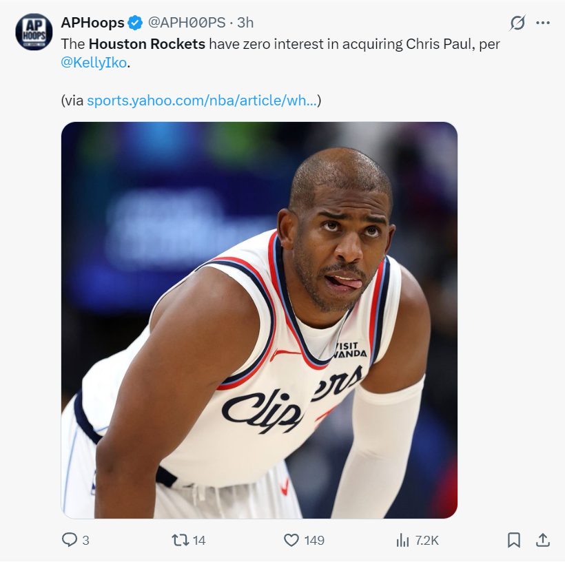 北京时间1月17日,根据《雅虎体育》记者凯利-伊科的报道,休斯顿火箭队对交易得到克里斯-保罗毫无兴趣。一天之前NBA名宿韦德建议火箭交易得到保罗这位组织者,但看起来乌度卡对保罗并不感冒。