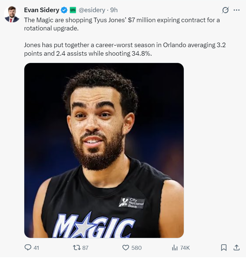 实际上目前的市场上火箭队补强一号位的人选还挺多,比如魔术队的泰厄斯-琼斯,他上赛季是跟杜兰特在太阳当队友,上赛季他的发挥不错可今年到了魔术场均只有3.2+2.4+三分命中率34.8%,魔术正在兜售他。