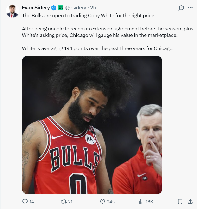 除此之外公牛队也已经在评估科比-怀特的交易价值,休赛期公牛没有跟他达成提前续约,他场均能拿19.1分是一个不错的双能卫,火箭队也可以对他发起追逐。